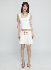 The Blossom Suit Skirt is our take on a classic pleated mini skirt with our love for whimsical cartoons infused in it. The skirt is structured in a light off white and adorned with hand dyed, custom made flower buttons on the front. Pair it with our Blossom Blazer for the complete look!