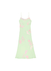 The Eloise Dress is a great combination of dreamy dress meets statement. This silky slip dress in mint green features delicate lace flower appliqués in shades of pink, a bias cut, and adjustable spaghetti straps. This dress is perfect for dancing the night away at a wedding or running barefoot through a field!