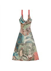 A long satin dress designed to hug you at the waist with a gently flared skirt. Featuring a draped cowl neck, pink velvet straps and lacing. Printed with a collage artwork of vintage folklore illustrations for the dreamiest spring dress.